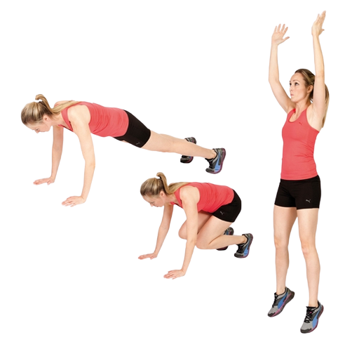 3. 일어나면서 점프 동작을 하고 다시 엎드린 자세를 만들어준다.