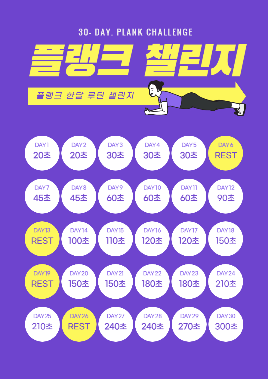처음부터 쉽다고 무리하지 마시고 추천드리는 대로 20초부터 매일매일 따라 해주시면 중간에 포기하는 일없이 끝까지 챌린지를 완수하실 수 있을겁니다.